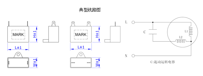 采用電工級聚丙烯薄膜作為介質、鋅鋁金屬化層作為電極,優質工程塑料外殼,阻燃環氧樹脂灌封,標準型快接端子引出,